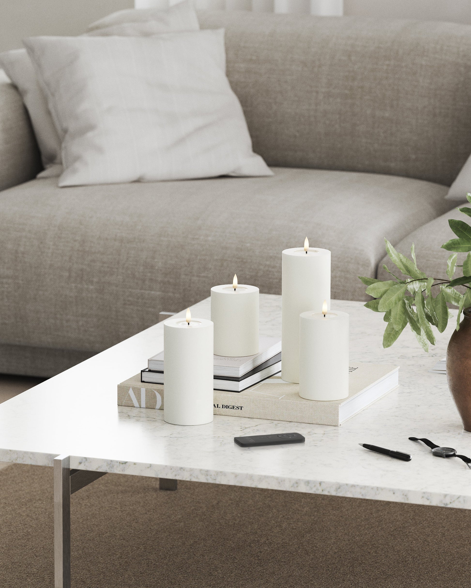 De hvide bloklys passer ind i de fleste hjem og giver et roligt og klassisk udtryk, der fungerer smukt året rundt. Brug dem samlet i en dekoration eller fordel dem i hjemmet for en gennemført og hyggelig stemning.
